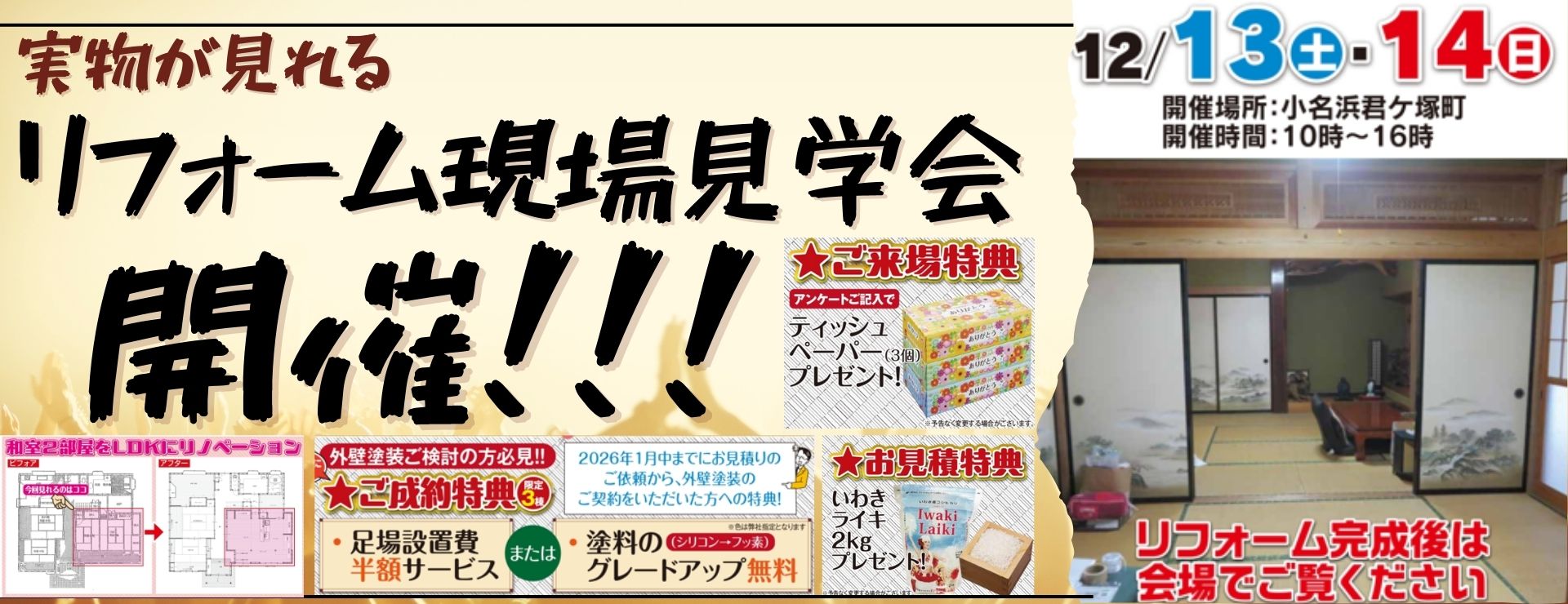 第118回 新春大初売り祭 ■日時■ 2025年10月3日(金)4日(土)、5日(日) 10:00~16:45 ■会場■ クリナップいわきショールーム いわき市鹿島町御代字九反田51-5 ----------------- [お電話からのご予約] フリーダイヤル:0120-168-375 初めてホームページのフォームから 事前のご予約をいただいた方には QUOカード5,000円分プレゼント! ホームページでご予約はこちらから LINEやオンラインでのお問合せも受け付けております。 LINEでご相談はこちらから オンライン相談はこちらから ----------------- 住まいが良くなれば暮らしが良くなり、暮らしが良くなれば毎日が楽しくなります♪ お家のお困り事をリフォームで解消し、楽しく快適なお家時間を過ごしましょう。 ショールームで実際に商品を見ながら相談ができるこの機会をぜひご活用ください。 WEBやカタログからも情報を集めることができますが、実物を見るとリフォーム後のイメージがぐっと膨らみます。 リフォーム志賀塗装はご相談無料、お見積り、点検も無料で対応いたします。 まずはお話だけでも大歓迎です! 当日はみなさまへの日頃の感謝をこめて、嬉しい特典盛りだくさん、楽しんでいただける企画もご準備しております。 お気軽にご来場ください! ご希望のお時間にご相談いただけるよう、事前にご予約いただくことをおすすめしております。 [お電話からのご予約] フリーダイヤル:0120-168-375 初めてホームページのフォームから 事前のご予約をいただいた方には QUOカード5,000円分プレゼント! ホームページでご予約はこちらから LINEやオンラインでのお問合せも受け付けております。 LINEでご相談はこちらから オンライン相談はこちらから ---------------