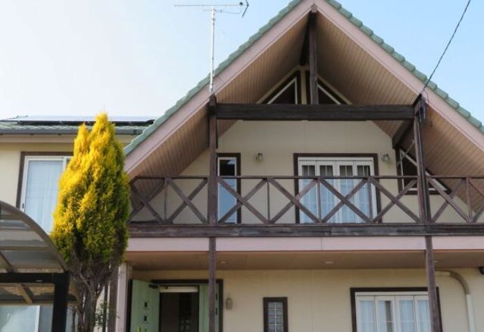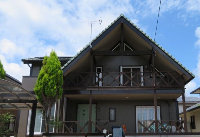 以前の明るいベージュから一転、建物全体を落ち着いたダークトーンで統一しました。傷みが目立っていた木製バルコニーや破風板も、丁寧にケレン・塗装を施すことで、深みのある美しい質感が復活。グリーンの玄関ドアがアクセントとして映える、重厚かつ洗練された外観へと生まれ変わりました。