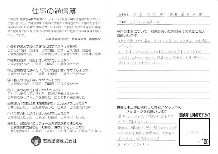 藤田さんは着工日も朝一顔を出していただいて、流れや時間の説明もあり、予定通り完了したので大変満足しています。