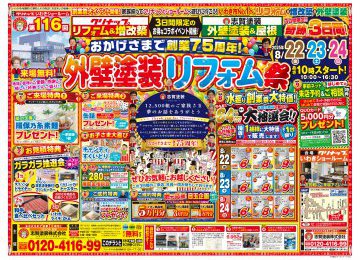 第116回 外壁塗装・リフォーム祭 ■日時■ 2025年5月9日(金)10日(土)、11日(日) 10:00~16:45 ■会場■ クリナップいわきショールーム いわき市鹿島町御代字九反田51-5 ----------------- [お電話からのご予約] フリーダイヤル:0120-168-375 初めてホームページのフォームから 事前のご予約をいただいた方には QUOカード5,000円分プレゼント! ホームページでご予約はこちらから LINEやオンラインでのお問合せも受け付けております。 LINEでご相談はこちらから オンライン相談はこちらから ----------------- 住まいが良くなれば暮らしが良くなり、暮らしが良くなれば毎日が楽しくなります♪ お家のお困り事をリフォームで解消し、楽しく快適なお家時間を過ごしましょう。 ショールームで実際に商品を見ながら相談ができるこの機会をぜひご活用ください。 WEBやカタログからも情報を集めることができますが、実物を見るとリフォーム後のイメージがぐっと膨らみます。 リフォーム志賀塗装はご相談無料、お見積り、点検も無料で対応いたします。 まずはお話だけでも大歓迎です! 当日はみなさまへの日頃の感謝をこめて、嬉しい特典盛りだくさん、楽しんでいただける企画もご準備しております。 お気軽にご来場ください! ご希望のお時間にご相談いただけるよう、事前にご予約いただくことをおすすめしております。 [お電話からのご予約] フリーダイヤル:0120-168-375 初めてホームページのフォームから 事前のご予約をいただいた方には QUOカード5,000円分プレゼント! ホームページでご予約はこちらから LINEやオンラインでのお問合せも受け付けております。 LINEでご相談はこちらから オンライン相談はこちらから ---------------