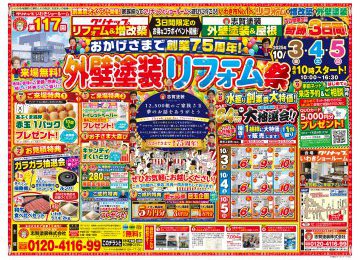 第117回 外壁塗装・リフォーム祭 ■日時■ 2025年10月3日(金)4日(土)、5日(日) 10:00~16:45 ■会場■ クリナップいわきショールーム いわき市鹿島町御代字九反田51-5 ----------------- [お電話からのご予約] フリーダイヤル:0120-168-375 初めてホームページのフォームから 事前のご予約をいただいた方には QUOカード5,000円分プレゼント! ホームページでご予約はこちらから LINEやオンラインでのお問合せも受け付けております。 LINEでご相談はこちらから オンライン相談はこちらから ----------------- 住まいが良くなれば暮らしが良くなり、暮らしが良くなれば毎日が楽しくなります♪ お家のお困り事をリフォームで解消し、楽しく快適なお家時間を過ごしましょう。 ショールームで実際に商品を見ながら相談ができるこの機会をぜひご活用ください。 WEBやカタログからも情報を集めることができますが、実物を見るとリフォーム後のイメージがぐっと膨らみます。 リフォーム志賀塗装はご相談無料、お見積り、点検も無料で対応いたします。 まずはお話だけでも大歓迎です! 当日はみなさまへの日頃の感謝をこめて、嬉しい特典盛りだくさん、楽しんでいただける企画もご準備しております。 お気軽にご来場ください! ご希望のお時間にご相談いただけるよう、事前にご予約いただくことをおすすめしております。 [お電話からのご予約] フリーダイヤル:0120-168-375 初めてホームページのフォームから 事前のご予約をいただいた方には QUOカード5,000円分プレゼント! ホームページでご予約はこちらから LINEやオンラインでのお問合せも受け付けております。 LINEでご相談はこちらから オンライン相談はこちらから ---------------