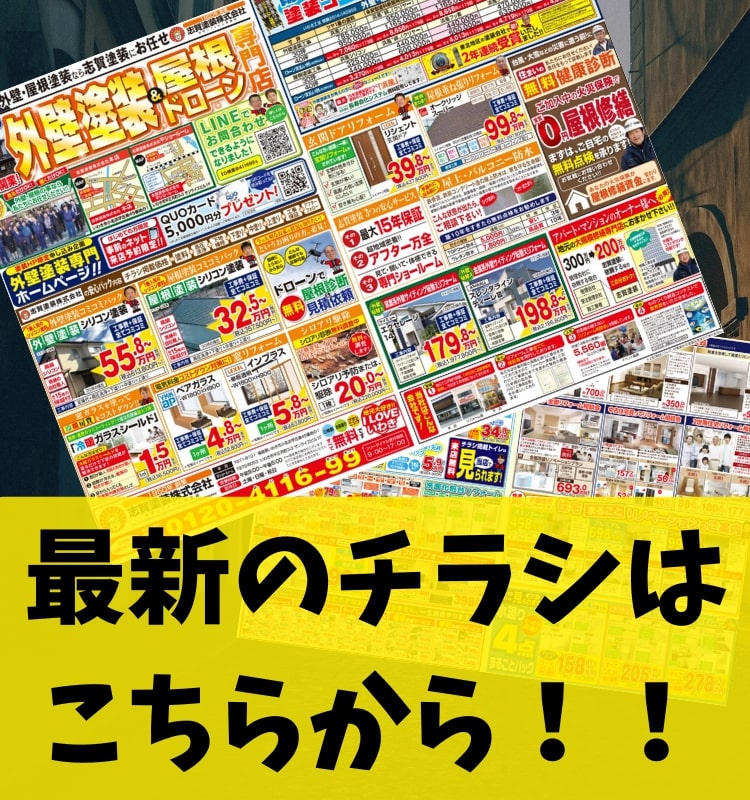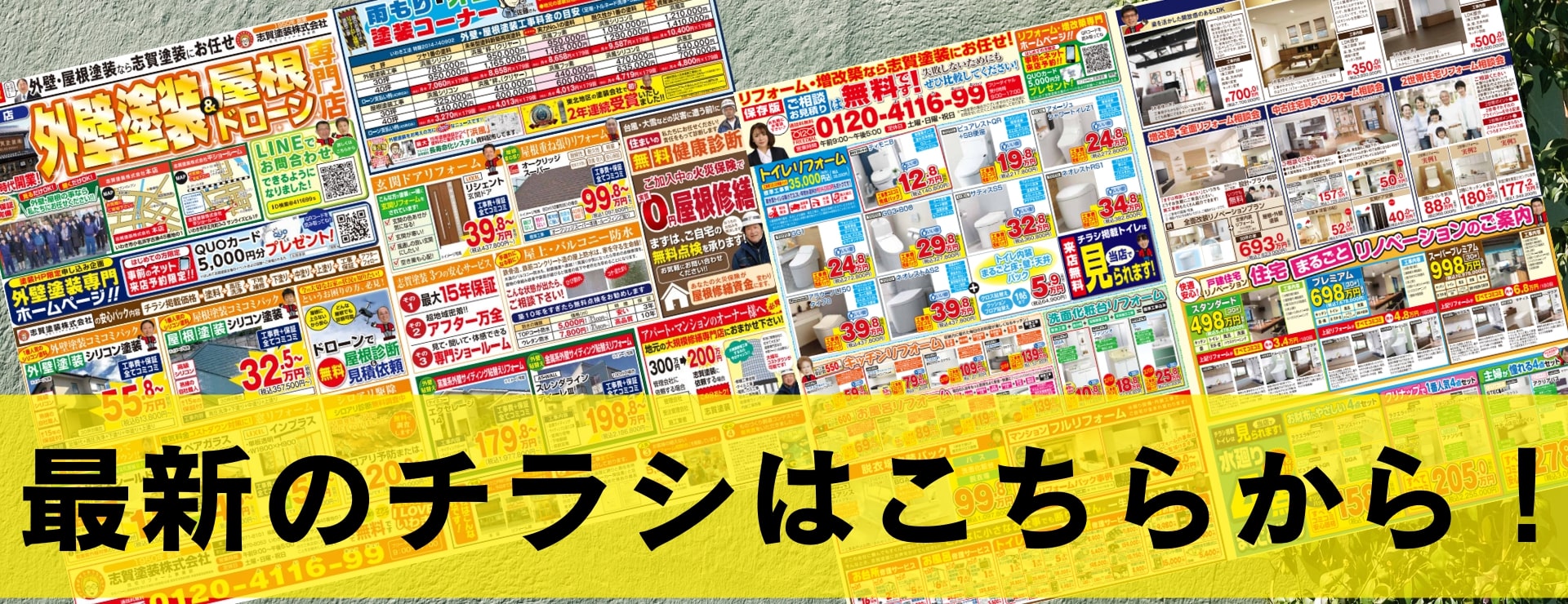こんにちは、リフォーム志賀塗装です。 最新チラシをご案内いたします! 志賀塗装だけの特別価格やリフォームに使用できる補助金のお知らせなど、お得な最新情報満載です! 「こんなことも頼めるの?」 「どこに相談していいかわからない…」 そんなちょっとしたお困りごとを解決する、修理、小工事サービスもご好評いただいております。 どんな小さなお仕事でも一生懸命対応させていただきますので、私どもにお任せください! 上記のサービスはほんの一例です。記載のない内容でもお気軽にご相談ください。 スタッフがこれまでの経験を活かし、お客様のご希望、ご自宅の状態に合わせたあなただけのプランをご提案いたします! ご相談、お見積り依頼のみでも歓迎いたします。 一度ご依頼いただいたからと、その後しつこい営業をすることはございません。 迷った時には、まずご連絡ください! 住まいのお悩み事は、志賀塗装へお気軽にお問合せください! ご相談はもちろん、お見積も無料です。 お電話&オンラインでのお問合せも受け付けております。 LINEで気軽に相談はこちらから オンライン相談はこちらから