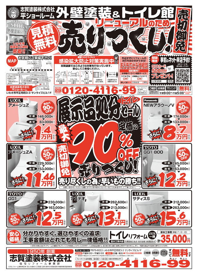 ただ今ショールーム展示品のトイレ売尽しセールを開催しております。