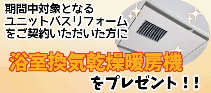 2020年12月25日までにお申込みいただき、対象となるユニットバスリフォームをご成約いただいた方に、もれなく【浴室換気乾燥暖房機】をプレゼントいたします!