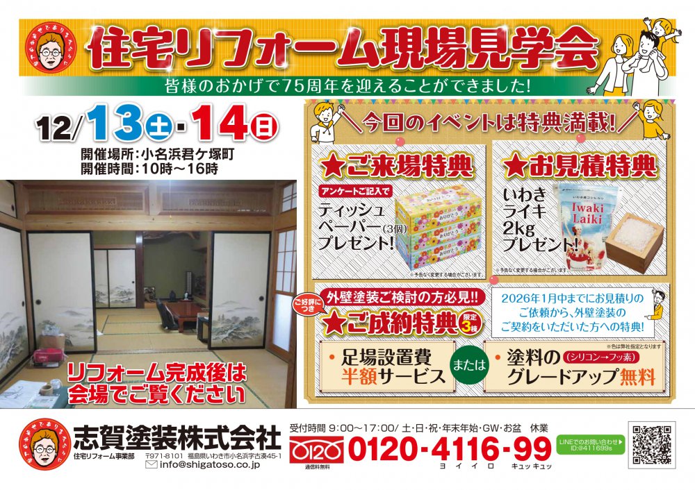 おかげさまで志賀塗装は75周年を迎えました 。 皆様への感謝を込め、福島県いわき市小名浜にて「住宅リフォーム現場見学会」を開催いたします 。