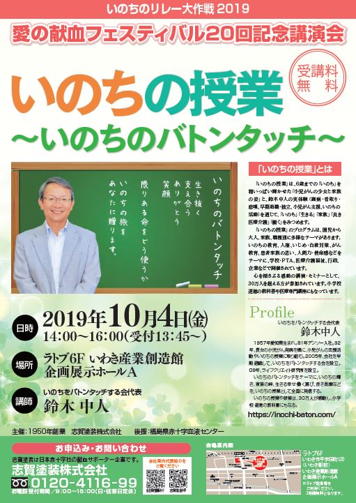 10月4日(金)に、いのちをバトンタッチする会代表の鈴木 中人さんをお招きしての講演会を開催いたします。