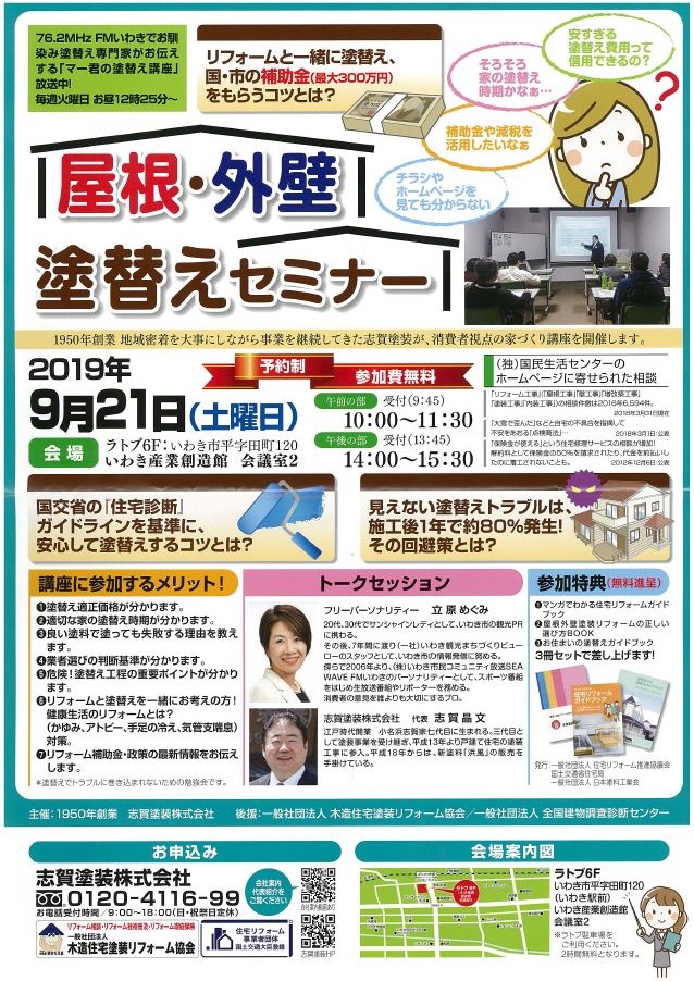本日は、9月の「屋根・外壁塗替えセミナー」のお知らせです。