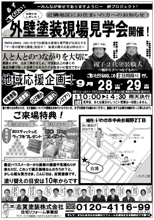 現場見学会の開催場所などは、志賀塗装【0120-4116-99】にお問い合わせください。