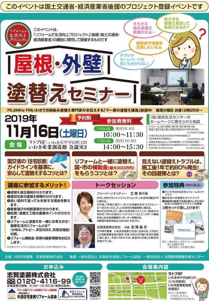 本日は、11月の「屋根・外壁塗替えセミナー」のお知らせです。