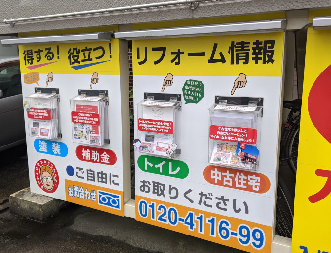 志賀塗装の平ショールームでは、店舗の外に7つの透明なポストを設置しさまざまなリフォームの情報をご提供しています。