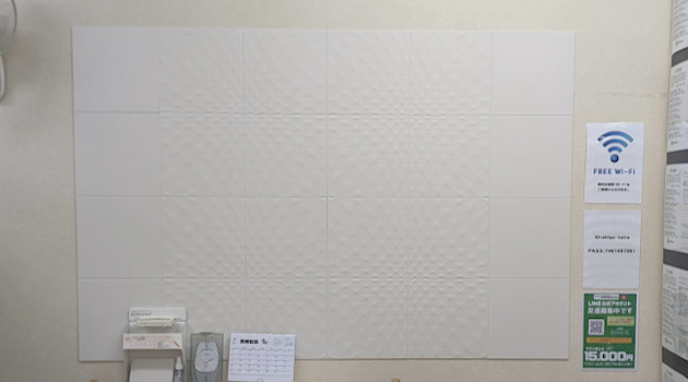 志賀塗装の平ショールームでは、壁の一部に「エコカラット(メーカー:LIXIL)」を取付けています。