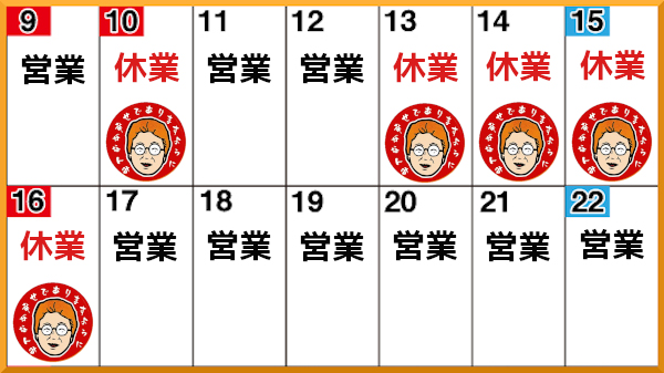 連休期間前後の営業日・休業日は下のカレンダーの通りです。