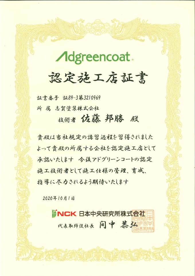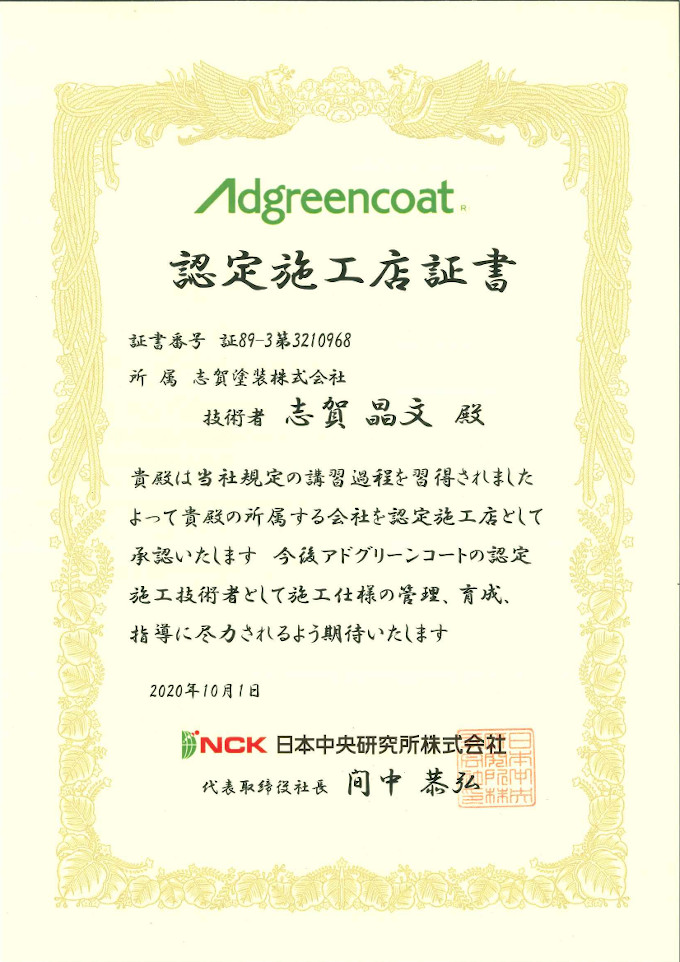 遮熱塗料アドグリーンコートの「認定施工技術者講習会」を受講し、認定施工店として承認していただきました。