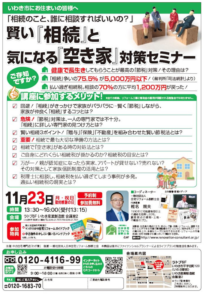 相続と空き家対策について、プロを招いての無料セミナーを開催いたします。
