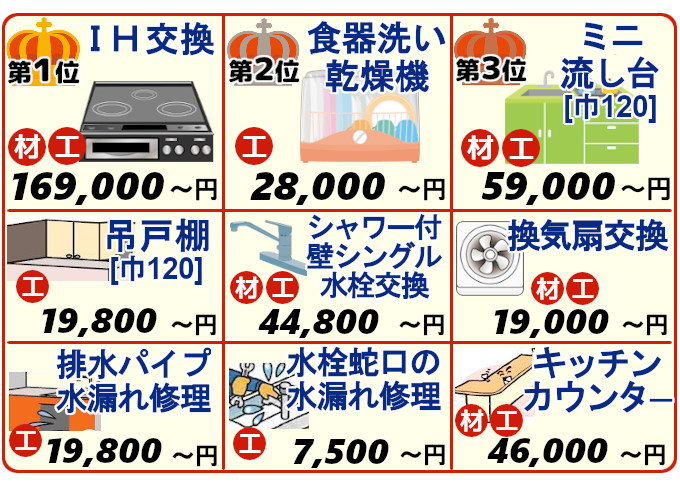 という方には、コンロや水栓、換気扇、照明などの部分交換という方法がございます。