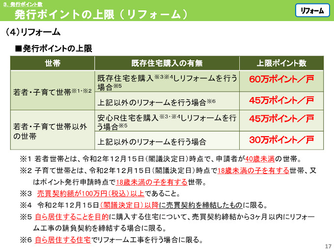 対象のリフォームを行うことで最大30万円相当のポイント、さらに条件を満たしているものについては最大60万円相当のポイントが発行されます。