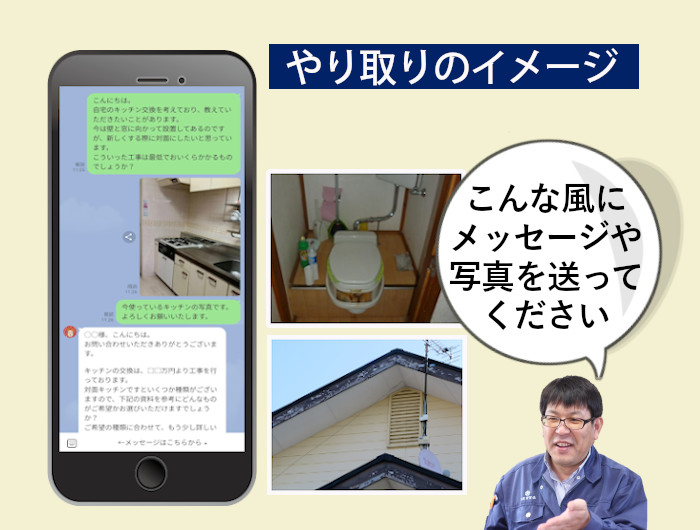 ご検討中の内容とご一緒にリフォームしたい箇所のお写真をお送りいただければ、アドバイザーが確認しご返信いたします。