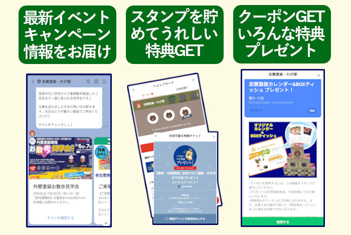 LINE限定で、特典プレゼントのクーポンやスタンプカードもございます。ぜひご利用ください。