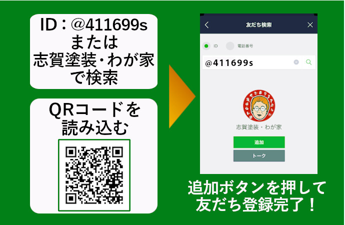 [志賀塗装・わが家]のLINE公式アカウントから、お気軽にお問合せ、リフォームの無料お見積もり依頼がご利用いただけます。