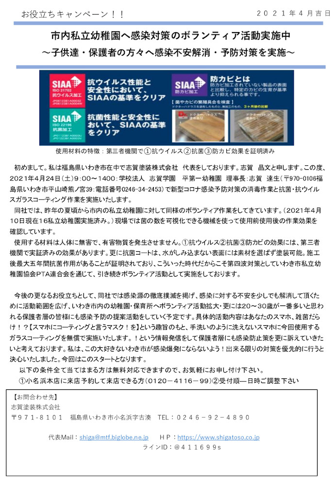 今後の更なるお役立ちとして、同社では感染源の徹底撲滅を掲げ、感染に対する不安を少しでも解消して頂くために活動範囲を広げ、いわき市内の幼稚園・保育所へボランティア活動拡大・更には20~30歳が一番多いと思われる保護者層の皆様にも感染予防の提案活動をしていく予定です。具体的活動内容はあなたのスマホ、雑菌だらけ!?【スマホにコーティングと言うマスク!を】という趣旨のもと、手洗いのように洗えないスマホに今回使用するガラスコーティングを無償で実施いたします。!という情報発信をして保護者層にも感染防止策を更に訴えていきたいと考えております。私は、この大好きないわき市が感染爆発にならないよう!出来る限りの対策を優先的に行うと決心いたしました。今回はこのスタートとなります。