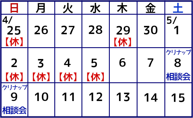 連休期間前後の営業日・休業日は下のカレンダーの通りです。