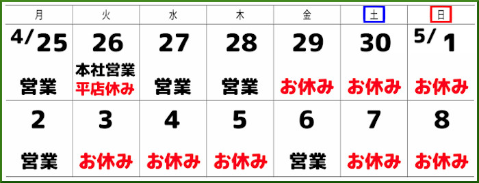 連休期間前後の営業日・休業日は下のカレンダーの通りです。