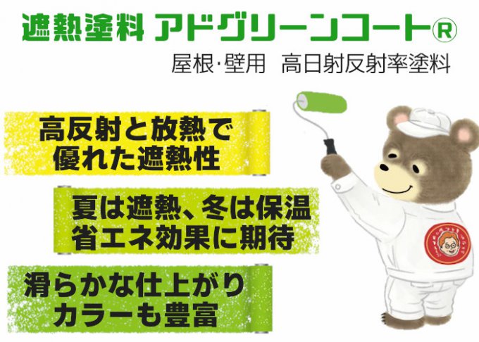 アドグリーンコート®は、ヒートアイランド対策のために放熱にこだわって開発された屋根、壁用の塗料です。