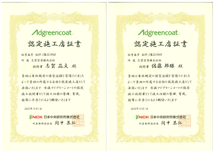 志賀塗装も規定の講習を受講し、認定施工店の証書をいただきました。