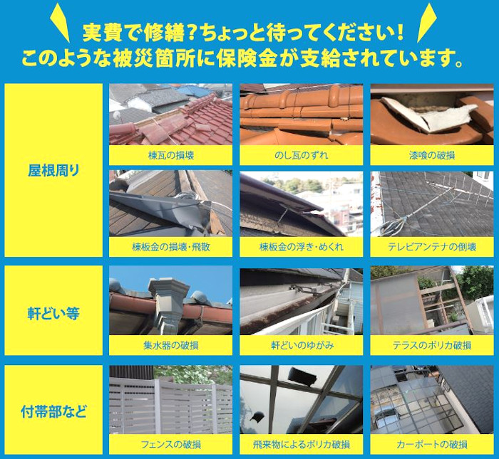 台風や突風で板金が飛んでしまった(めくれてしまった)場合や、強風による瓦の破損など。