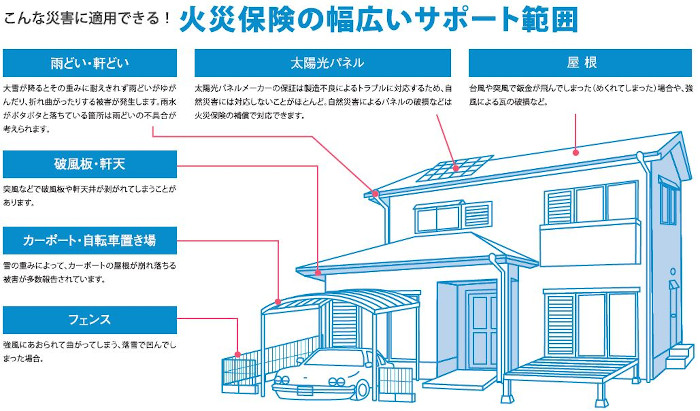 しかしほとんどの火災保険で、風災や雹(ひょう)災、落雷など自然災害による被害も補償範囲としています。その他にも様々な補償を受けることが可能となりますが、その範囲は保険の種類によって異なります。