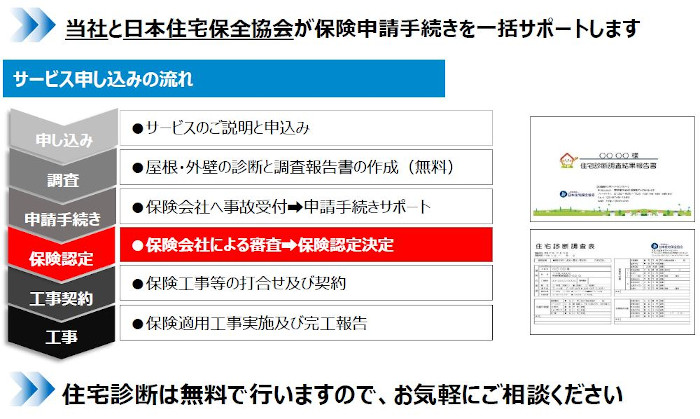 保険申請のプロフェッショナル「一般社団法人 日本住宅保全協会」と協力した申請サポート体制を確立しておりますので、スムーズなお手伝いが可能です。