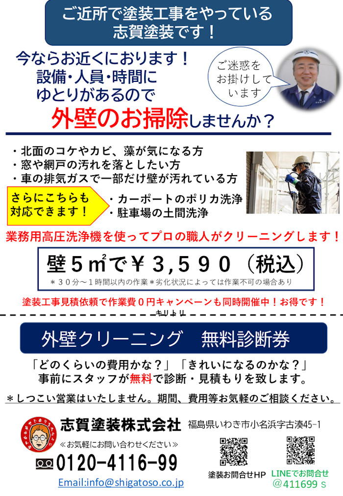 ご近所で志賀塗装の工事を見かけた際には、ぜひ外壁のお掃除をご依頼ください!