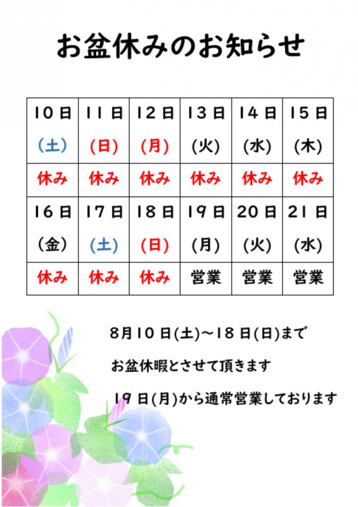 平素より格別のご愛顧を賜り、誠にありがとうございます。お盆休みのため、以下の期間中は休業とさせていただきます。