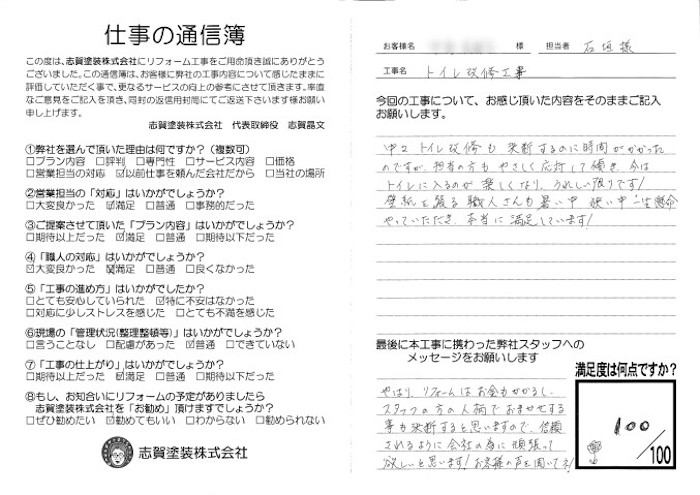 やはりリフォームはお金もかかるし、スタッフの方の人柄でおまかせする事も決断すると思いますので、信頼されるように会社の為に頑張ってほしいと思います!お客様の声を聞いてね。
